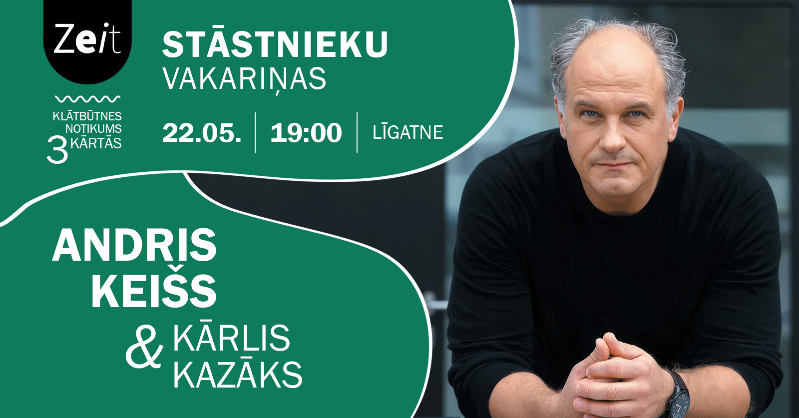 22. maijā plkst. 19:00 aicinām uz šīs sezonas noslēdzošajām Zeit Stāstnieku Vakariņām kopā ar Andri Keišu un Kārli Kazāku!